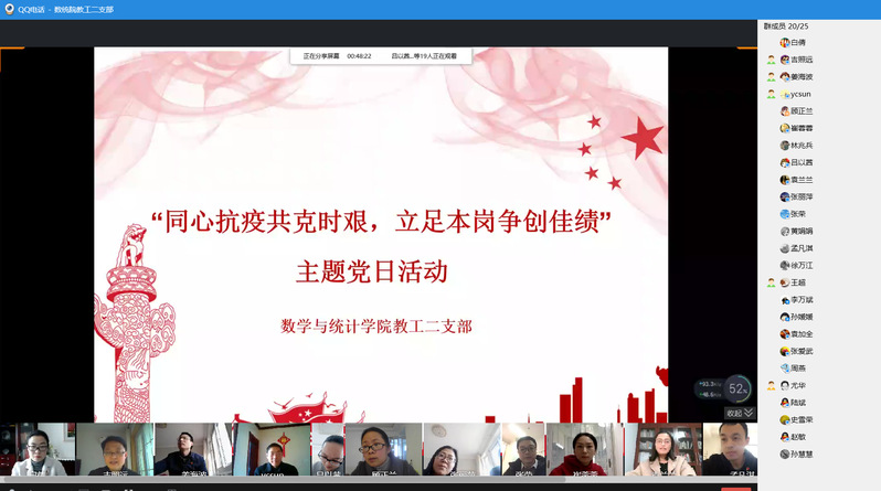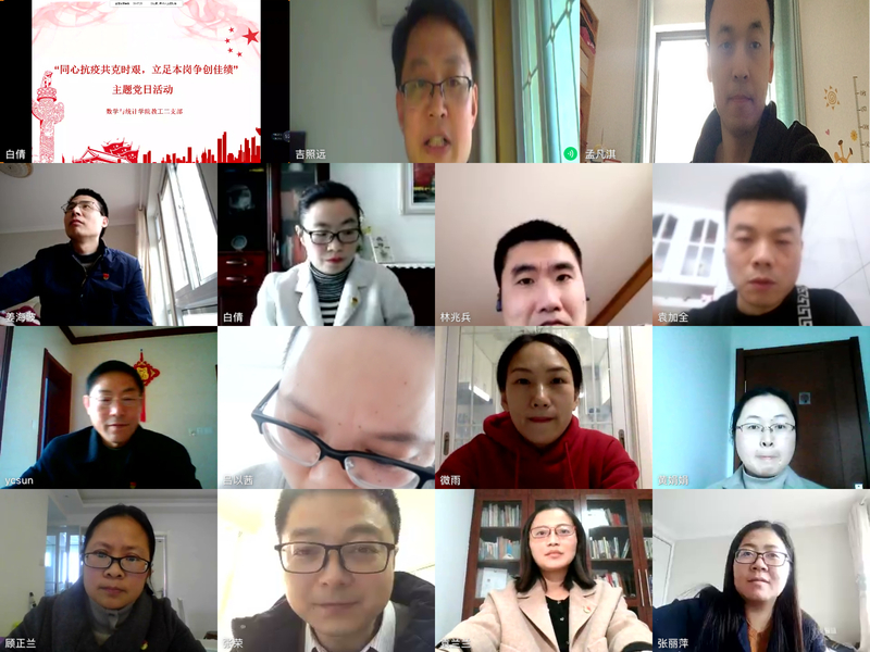 3月25日下午,数统院各党支部95名师生党员,在线上开展“同心抗疫共克时艰,立足本岗争创佳绩”主题党日活动。