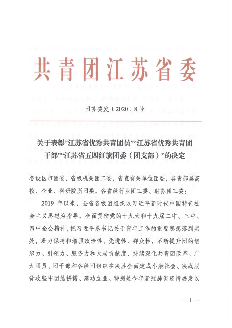 近日,共青团江苏省委发文表彰了一批“江苏省优秀共青团员”“江苏省优秀共青团干部”“江苏省五四红旗团委(团支部)”。公司团总支被表彰为“江苏省五四红旗团总支”。