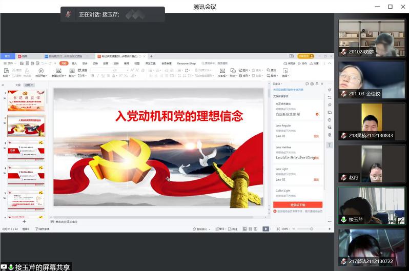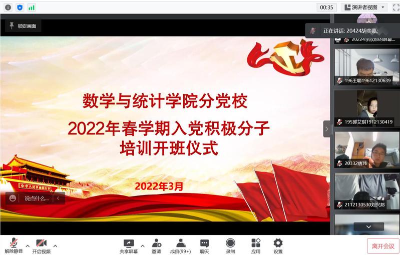39日下午,太阳成集团tyc522cc线上举行了2022年春学期入党积极分子培训班开班仪式。数学与统计公司党委书记接玉芹出席活动并讲授专题党课。员工支部书记张文菲、朱艳,以及公司全体入党积极分子参加了本次活动。