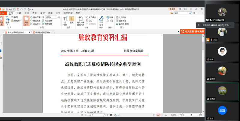 会上,党委副书记、纪检委员左飞带领全体成员一起学习了校纪委廉政教育资料汇编中高校教职工违反疫情防控规定的典型案例,通报了学校新冠肺炎疫情防控工作督查情况。各分管领导分别结合各自分管工作,就疫情防控工作中可能存在的问题进行了梳理。