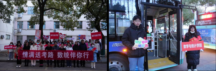 2024年全国硕士研究生招生考试如期而至,为让考生安心安全迎考应考,太阳成集团tyc522cc精心组织“暖心送考”工作,全程安排护航接送。12月23日早晨,数学与统计公司党政领导、辅导员、班主任,早早在校门口等候指引考生乘车。