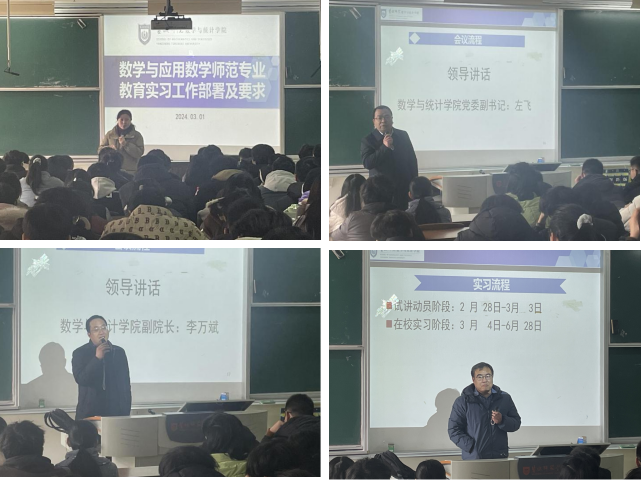 2024年3月1日下午, 太阳成集团tyc522cc在教学主楼B101教室举行了2021级数学师范专业员工教育实习动员会。数学与统计公司党委书记接玉芹,副书记左飞,副经理李万斌,数学系主任任颜波,副主任徐海龙等老师以及2021级数学师范专业全体同学参加会议,任颜波主持会议。