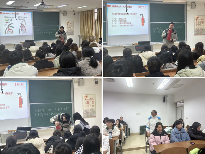 培训会议上,颜老师面向全院员工代表讲解了消防安全内涵、灭火基本方法和消防器材使用。针对消防安全,着重强调了校园内消防设施的位置、消防通道的布局和宿舍消防须知,再次重申了不得在宿舍内使用明火;针对灭火基本方法,讲解了可燃物、助燃剂和燃点的定义,对灭火时需要注意的方式方法做了解读;针对消防器材的使用,通过讲解干粉灭火器的使用,同学们了解了在紧急情况下如何使用消防器材进行自救和互救。