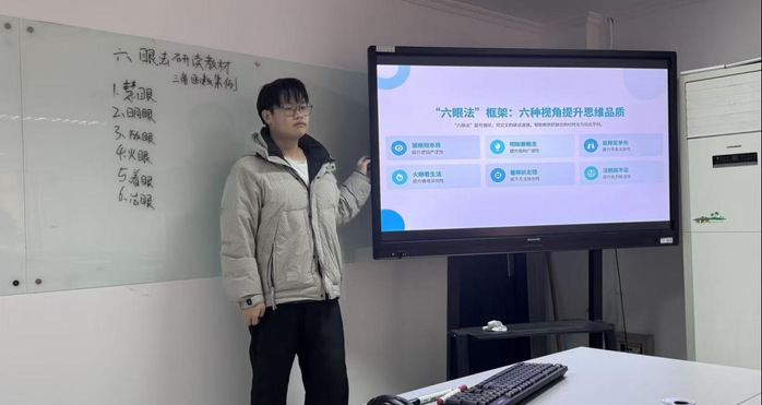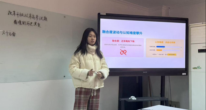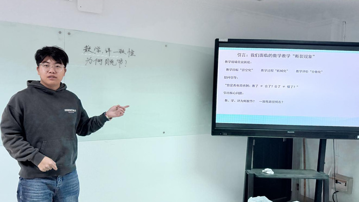 汇报环节中,戴模以“教学评一致性”为理论支架,探讨如何推动数学课堂从知识传授向素养培育深化。丁妍系统梳理改革开放以来高考试题情境的历史演变,并从六个维度展开逐层剖析。王婧结合教育改革背景,指出传统教学模式难以满足员工发展需求,进而阐释微项目化学习与“综合与实践”课程相融合的现实意义。刘宇则以人教A版“三角函数”整章内容为例,演示如何运用“六眼法”研读教材,超越文本表层,把握数学思维本质。