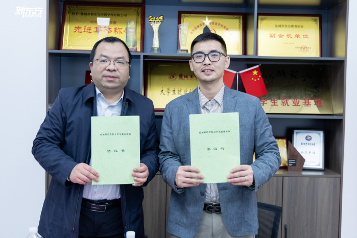 座谈尾声,签约与授牌仪式正式举行。左飞与卢维共同签署《实习就业基地合作协议》,并代表公司向盐城新东方教育文化发展有限公司授予“实习就业基地”牌匾。